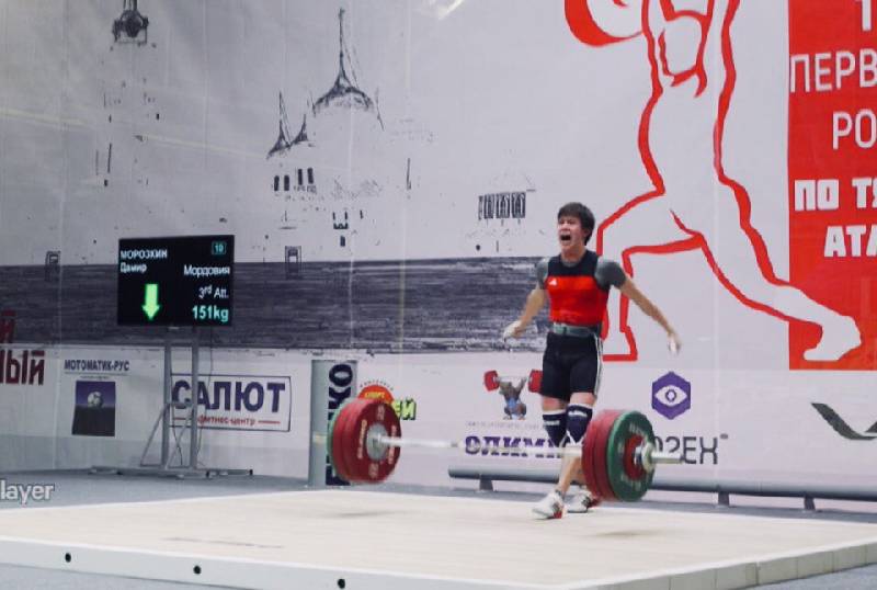 23 февраля в спор вступили участники старшего возраста. В весовой категории 69 кг. Республику Мордовию и Рузаевку представлял воспитанник А.С.Толстякова Дамир Морозкин. Всего в категории, где выступал Дамир, было около сорока участников. Среди них особо выделялся тяжелоатлет из Новосибирской области Тимур Долбышев. В первом упражнении – рывке – Долбышев показывает лучший результат – 126 кг. Дамир фиксирует снаряд весом 120 кг. и занимает третье место. В толчке Морозкин блестяще использует все три подхода: вначале поднимает 142 кг., затем 146 кг. и потом в прекрасном стиле толкает 151 кг. и выходит на первое место! Тем самым Дамир улучшил личный рекорд почти на 10 кг.