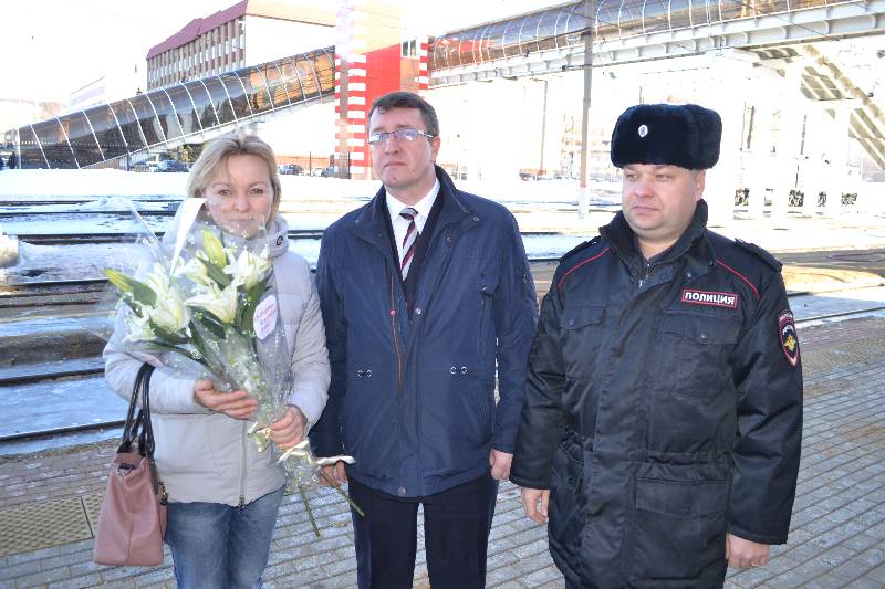 На железнодорожном вокзале Рузаевка стражи правопорядка организовали поздравительные рейды для женщин работников железной дороги и женщин-пассажиров. Женщины получали в подарок от транспортных полицейских поздравления и букеты цветов со стикером «8 Марта В каждый Дом».