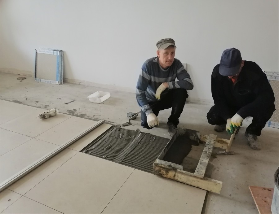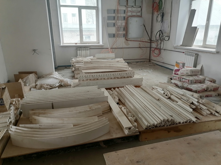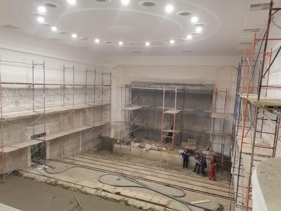 Сегодня, несмотря на выходные дни, на объекте трудилось 54 человека. Здесь одномоментно проводятся разные виды работ. В зрительном зале полностью восстановлена лепнина, сейчас идет заливка стяжки, формирование ступеней. Заключен контракт на поставку кресел, в июне начнется их монтаж. Полностью завершено устройство сетей водоснабжения, сетей связи. Скоро строители приступят к наружным сетям и возьмутся за фасад.