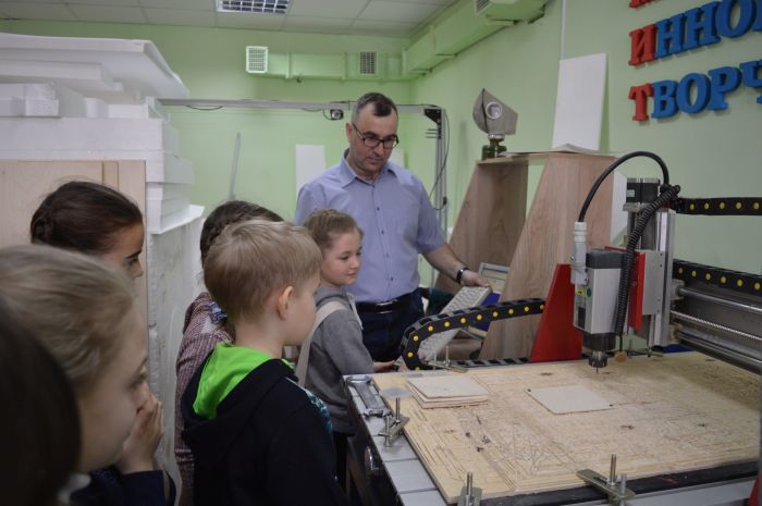 Также участники экскурсии ознакомились с промышленным оборудованием ЦМИТа: фрезерный станок, лезерно- гравировальная машина, станок для резки пенополистирола. С большим интересом школьники учились навыкам управления станками. Стоит отметить, что ребята очень неплохо научились управлять оборудованием. Например, включение, калибровка и запуск программы на «лазерной машине» для них уже не вызывало особых трудностей, а на станке для «резки пенопласта» ребята самостоятельно «резали» квадраты, овалы, лестницы и тд.