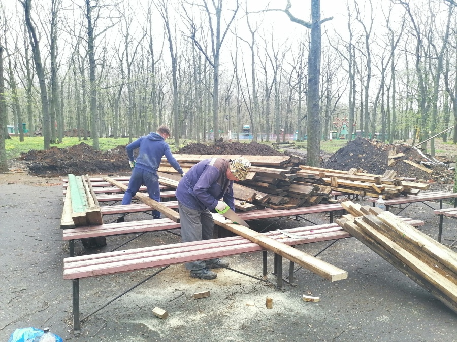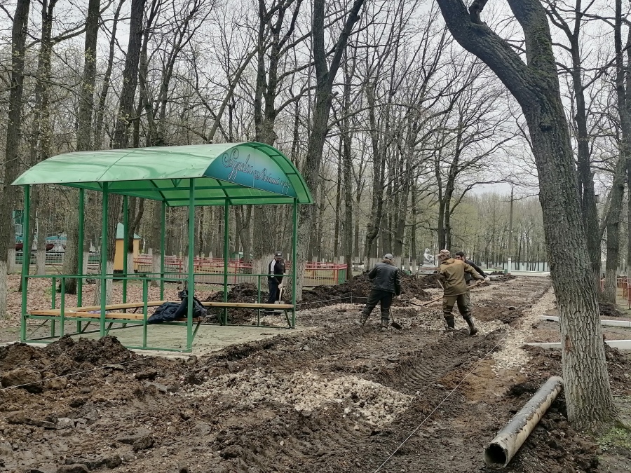 В парке культуры и отдыха произведен демонтаж старой сцены, готовится основание для новой. На месте будущих дорожек укладывают бордюр, выравнивают грунт.