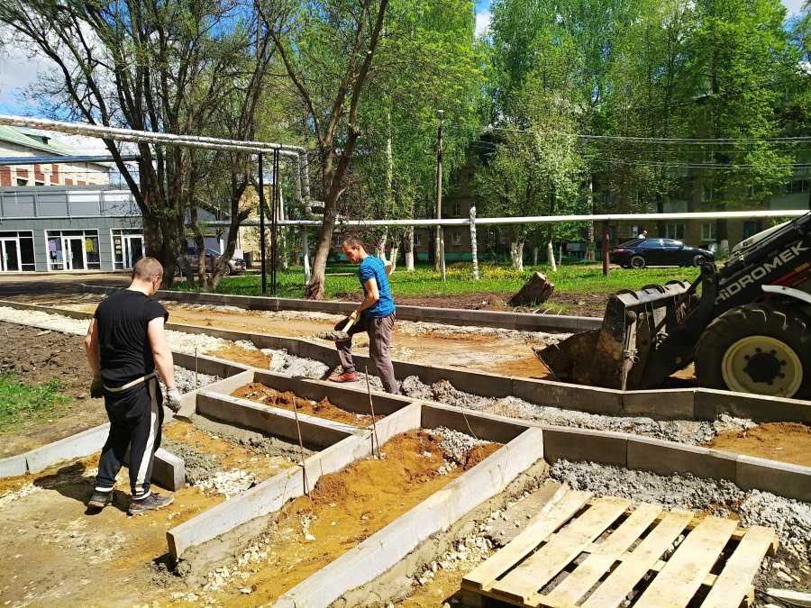 Подрядной организацией снят верхний слой асфальта, установлены бордюры у домов 4б и 3а, проводится формирование основания для тротуаров и пешеходных дорожек.