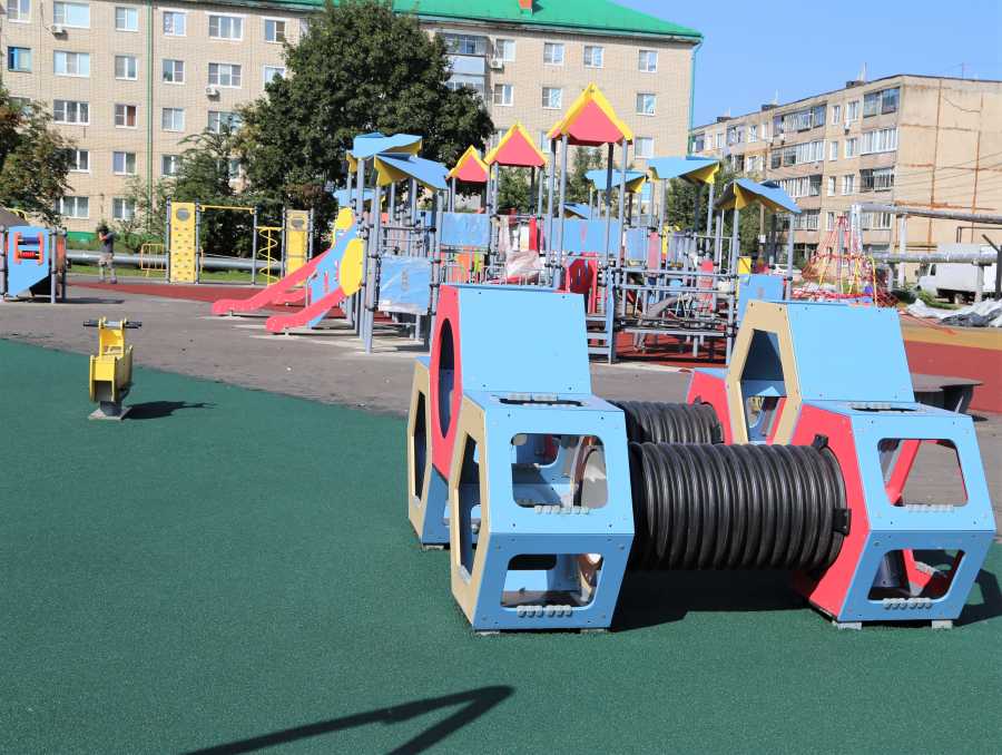 Остаются последние штрихи до окончания всех строительных работ. Специалисты завершают устройство покрытия из резиновой крошки на территории детских игровых элементов.