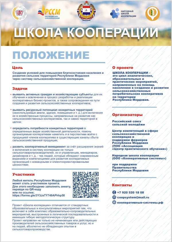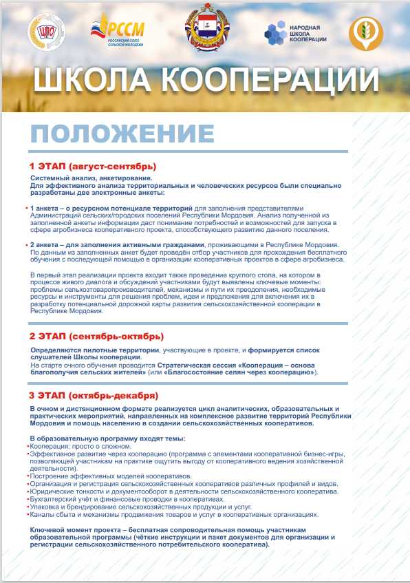 На территории Республики Мордовия стартовал проект «Школа кооперации», основными организаторами которого являются Центр компетенций в сфере сельскохозяйственной кооперации и поддержки фермеров Республики Мордовия (ПОО «Ассоциация «Центр практического обучения»), Российский союз сельской молодежи, при поддержке Правительства Республики Мордовия. Проект направлен не только на начинающих или действующих производителей сельскохозяйственных товаров и услуг, но и на людей, абсолютно не обладающих опытом в сельхозпроизводстве.