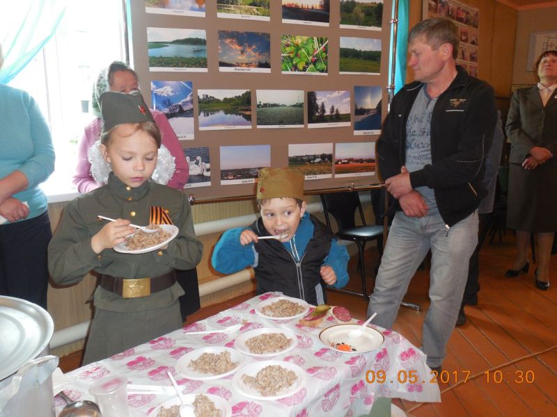 В Доме Культуры состоялся концерт: звучали военные песни и стихи в исполнении участников художественной самодеятельности. Всем пришлась по душе гречневая каша с тушенкой.