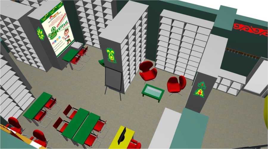 По проекту библиотека будет разделена на четыре зоны. В этнографической мастерской «Тарих», что в переводе с татарского - история, можно заняться творчеством, проводить выставки, мастер-классы, лекции. Для тематических встреч с большим количеством участников, конференций предусмотрена зона встречи читателей «Танышлык» - «знакомство». Здесь же производится обслуживание читателей с помощью современной автоматической системы ИРБИС.