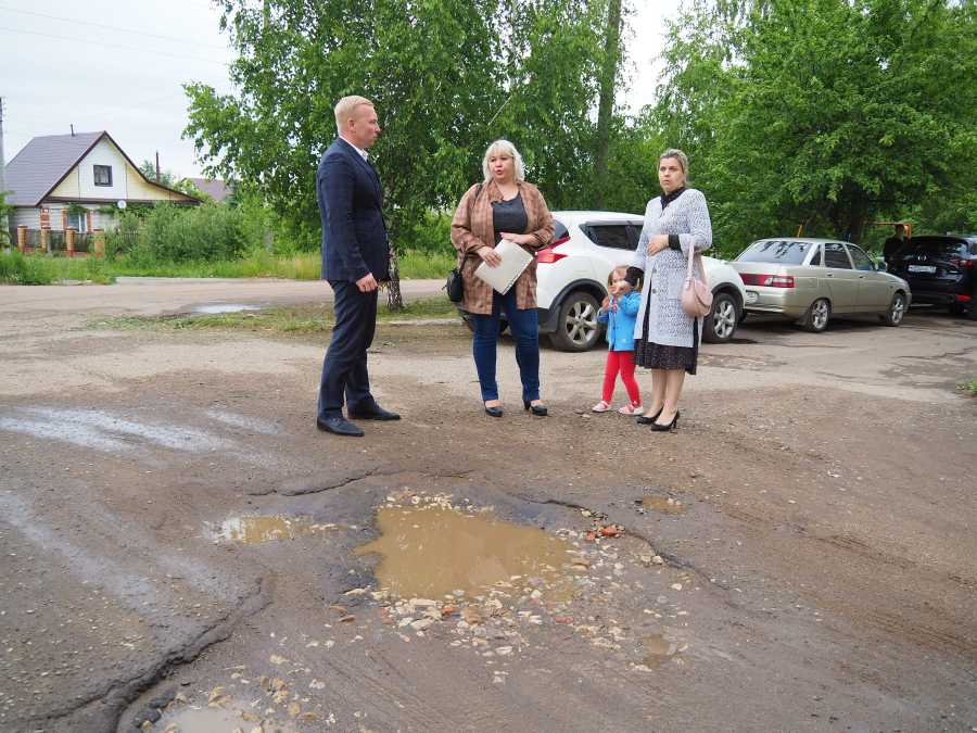 От них регулярно поступают обращения в социальные сети, в том числе в личный аккаунт мэра. На месте Алексей Юрьевич осмотрел состояние дворовой территории. Дорога в ямах и выбоинах, перед подъездами накиданы поддоны, так как во время дождя вода поднимается до второй ступени входной группы. А в сухую погоду жильцы спотыкаются об доски и портят свою обувь.