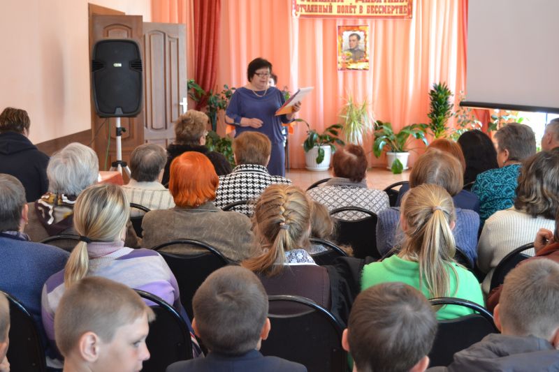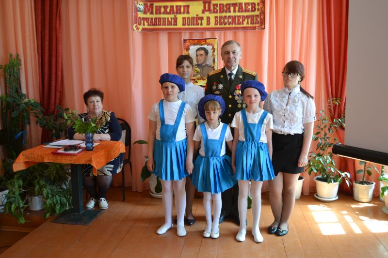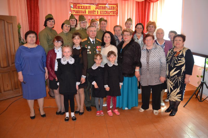 Затем Кузикова Г. Ш. рассказала биографию М.П.Девятаева. Детский танцевальный ансамбль "Радуга"- руководитель Чебуренкова И.Ю., исполнил танец "Катюша". Был показан документальный фильм "Догнать и уничтожить". Очень трогательно прозвучали стихи о войне в исполнении Малышева И., Леонова И., Астаховой О., они вызвали неподдельные слёзы у зрителей. В исполнении ансамбля "Рябинушка", под руководством Сильдушова В.М, прозвучали песни о летчиках из кинофильма "Небесный тихоход". Орлова Н. исполнила песню "Ах эти тучи в голубом". Гость вечера памяти - участник Афганской войны, подполковник в отставке Силантьев Б.Г. очень интересно рассказал о событиях в стране и о том, что мы не должны забывать тех, кто отдал свои жизни, чтоб над нами всегда было мирное небо. В заключении все зрители вместе с ансамблем "Рябинушка" стоя исполнили песню "Бухенвальский набат". Благодарю всех, кто принял участие в этом мероприятии.