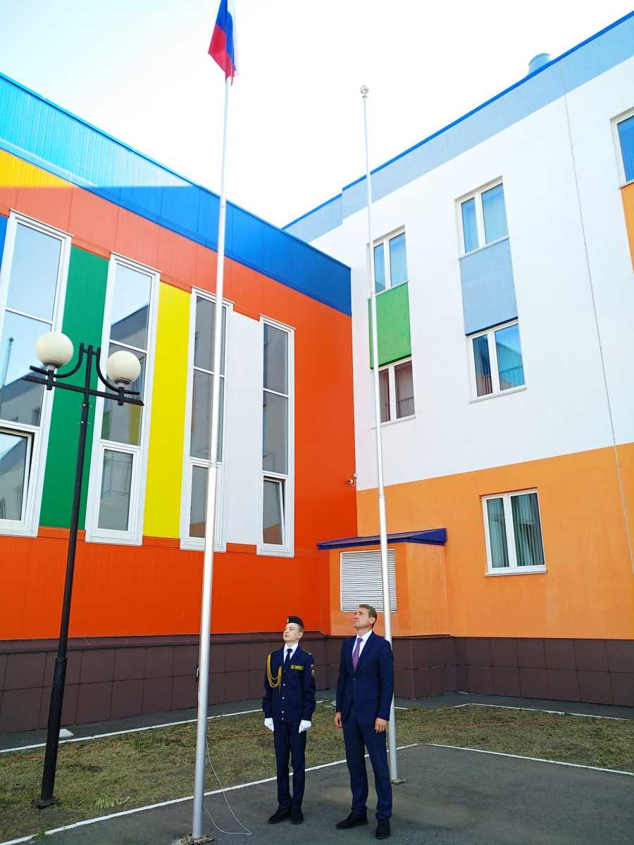 Право поднять флаг было предоставлено главе района Александру Юткину и кадету школы №5 Артему Астафьеву.
