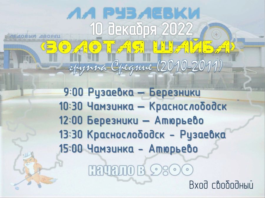9-10 декабря в ФОК «Ледовый» города Рузаевка состоятся игры очередного тура регионального этапа Всероссийских соревнований по хоккею с шайбой среди школьников на призы клуба «Золотая шайба». В пятницу, 9 декабря, играют представители младшей возрастной группы (2012-2013 гг.р.). На лед выйдут команды из Саранска, Рузаевки, Инсара, Больших Березников, Атюрьево, Чамзинки. В субботу, 10 декабря, силами померяются участники средней возрастной группы (2010-2011 гг.р.). В спор вступят представители Рузаевки, Чамзинки, Атюрьево, Краснослободска, Больших Березников. Приглашаем рузаевских любителей хоккея прийти поболеть за наши команды. Начало игр с 9.00. Вход свободный.