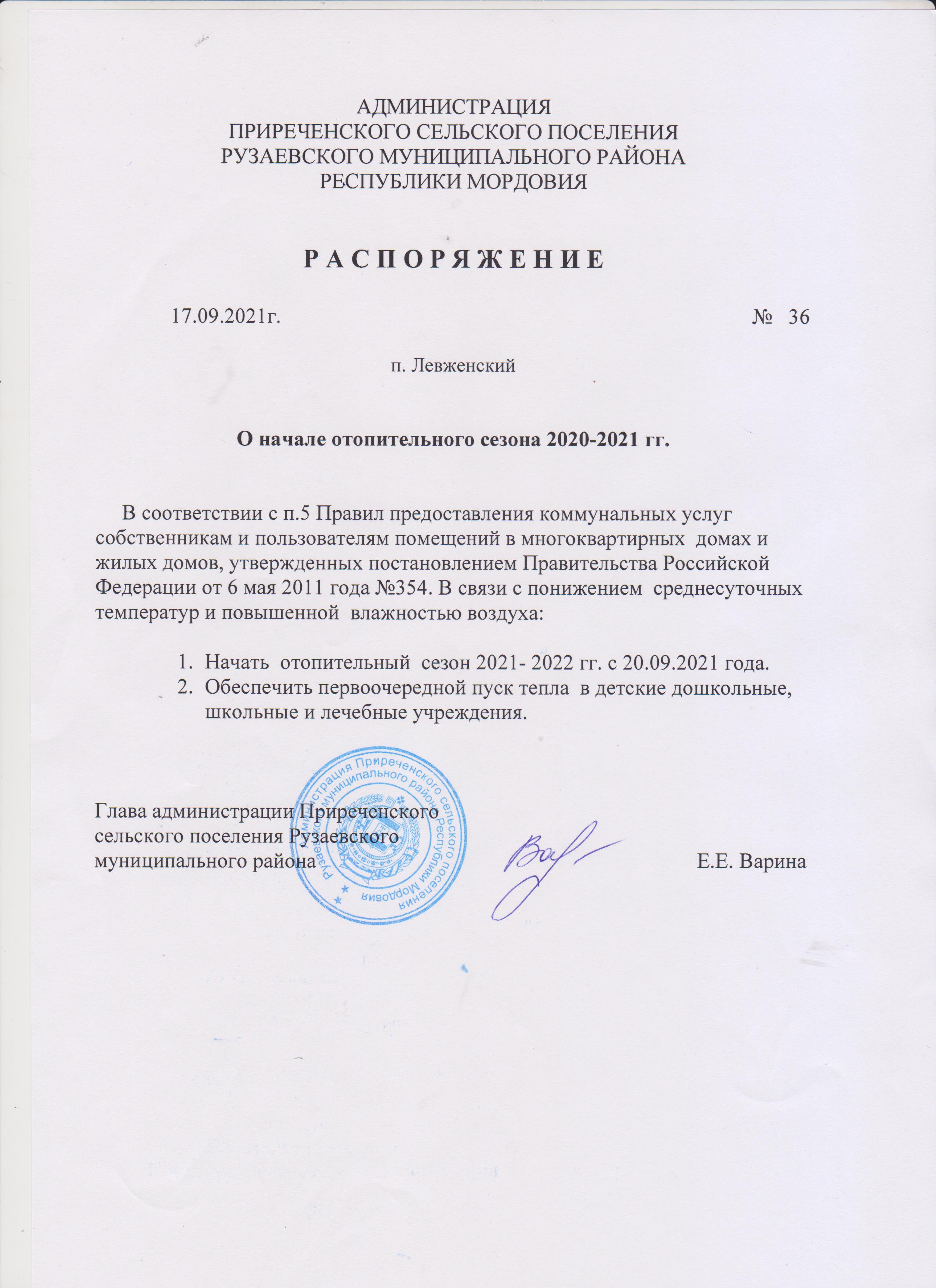Распоряжение администрации от 17.09.2021 г. № 36 О начале отопительного сезона 2020-2021 гг